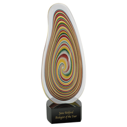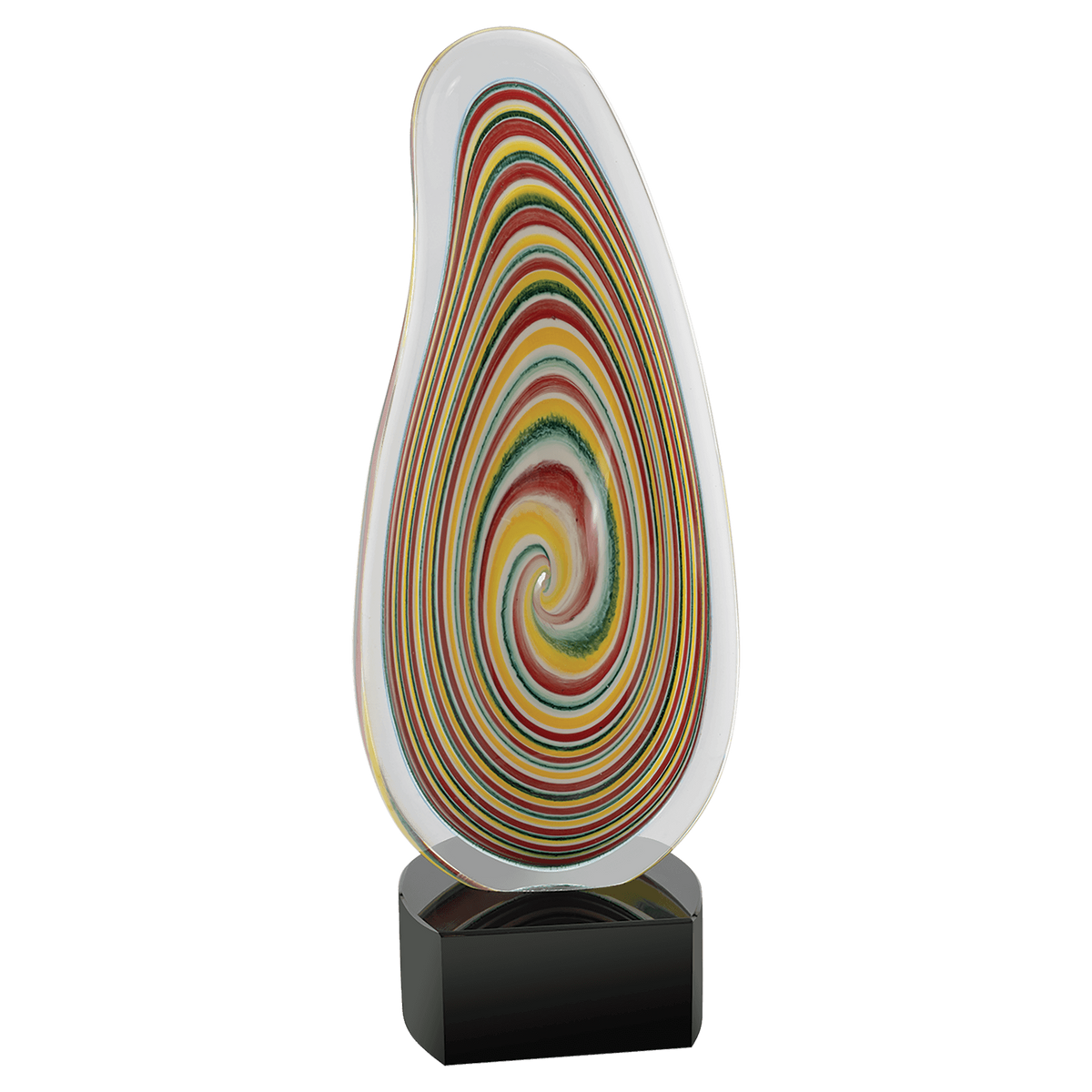 Artistically inspired hand blown glass sculpture. Each piece is uniquely different, colors and sizes will vary slightly. Premier Art Glass is mounted on a black glass base. Packaged individually in a lined gift